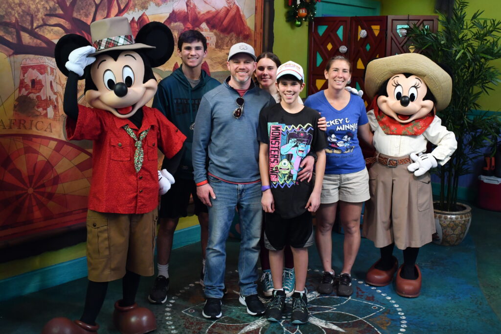 It wouldn’t be a Disney World vacation without a photo with Mickey and Minnie, and during the holidays, you get the added bonus of seeing them decked out in their holiday best! At Adventurers Outpost, they greet guests in adorable coordinating holiday safari outfits. The backdrop here is colorful, festive, and perfect for a Christmas family photo!